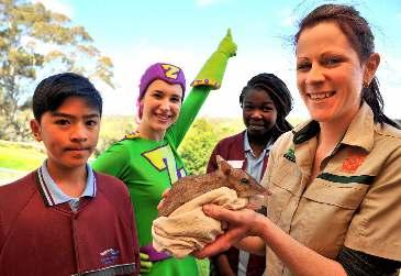 Manor Lakes P-12 College pupils Kevin and Raba with Werribee zoo mascot Zooper Girl and senior keeper Kat Thomson with an eastern barred bandicoot. (Damjan Janevski)