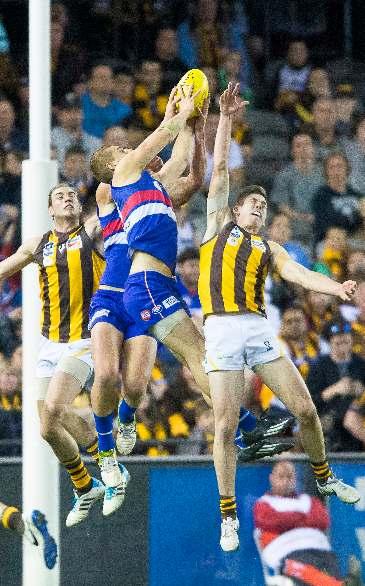 to mark a clearing kick out of defence that had a settling e ect on his side when the Hawks threatened. Moments later, the Bulldogs got their backbreaking goal when Jones booted his fourth to stretch the lead to 13 at the 27-minute mark. Jones put the icing on the sweetest of cakes with a h goal.