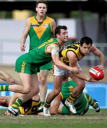 A bandaged Matt Dean clears the ball from the stoppage for Werribee Districts in the nals.
