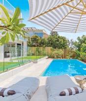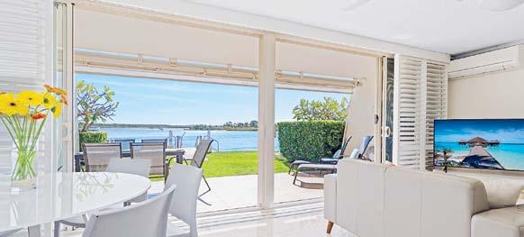 beguiles,whilstexemplifyingthemagicaloutdoors.Sets ofslide-awaywhiteshuttersandglassdoorscoalesces totheprivatenorth-facingundercoverterrace,thus articulatingthesuperlativeposition.Lawn,dottedwith exoticfoxtailpalmsextendstothetidalbeachandlong jetty/pontoon.Sundownersanyone?