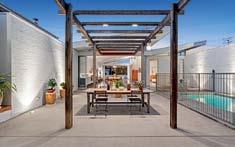 Sets of slide-away white shutters and glass doors open to the private north-facing undercover terrace.
