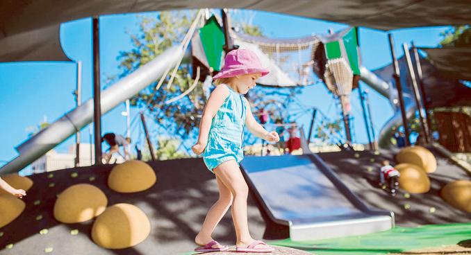 Perch up with a coffee and let the kids (and adults alike) explore the bright sculptural works of the rainbow serpent, Munda-Gadda at the adventure playground then cool off among Rod Laver Plaza’s popup water jets.