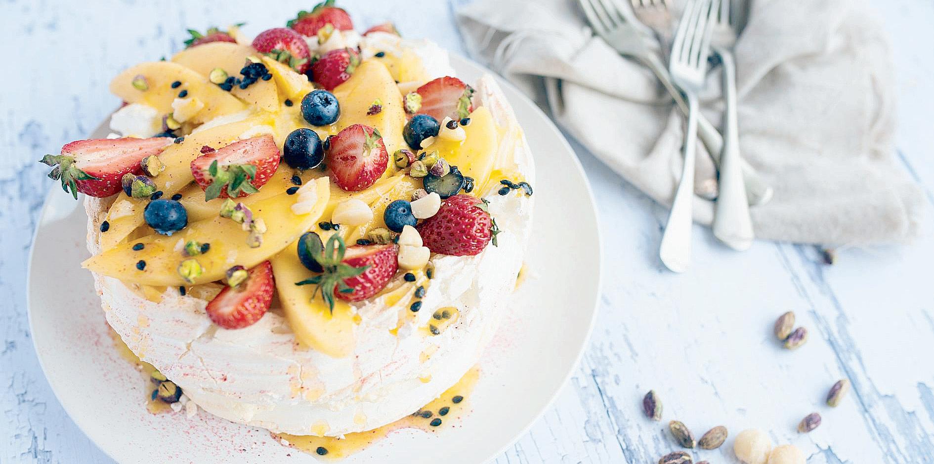 12. Spoon remaining cream, drizzle passionfruit pulp, assemble fruits, sprinkle remaining nuts and dust Davidson Plum powder on top of the meringue.