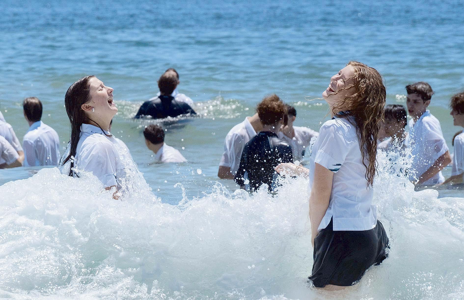 Year 12 studens across Noosa ran into the ocean in school uniform this week in what has become a tradition to mark the seniors final day of school and the beginning of their post-school lives.
