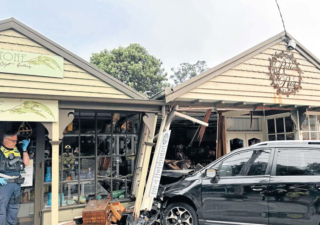 An allegedly stolen vehicle crashed straight into the front of Rubies and Rust and Touchstone Craft Gallery on Olinda-Monbulk Road in Olinda in the early hours of Friday morning, 16 January.