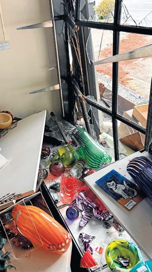 The car hit the post separating the two shops, knocking beautiful glass from the shelves and causing significant damage to Touchstone. The other store was also impacted, though the damage is believed to be less costly.