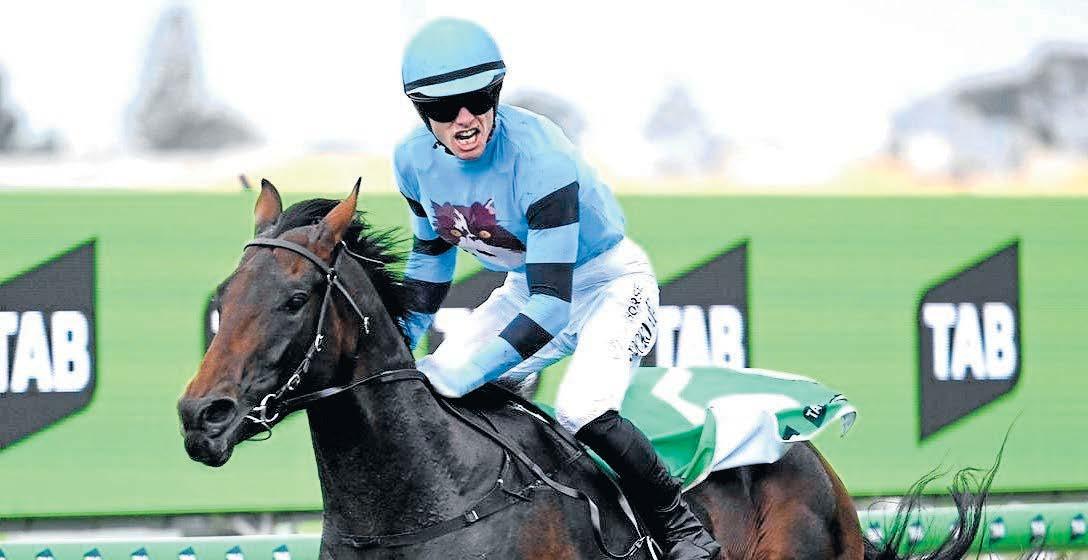Tom Stockdale celebrates with a roar as he partners Unit Five to victory in the $3m Magic Millions 2YO Classic at the Gold Coast on Saturday. (Trackside