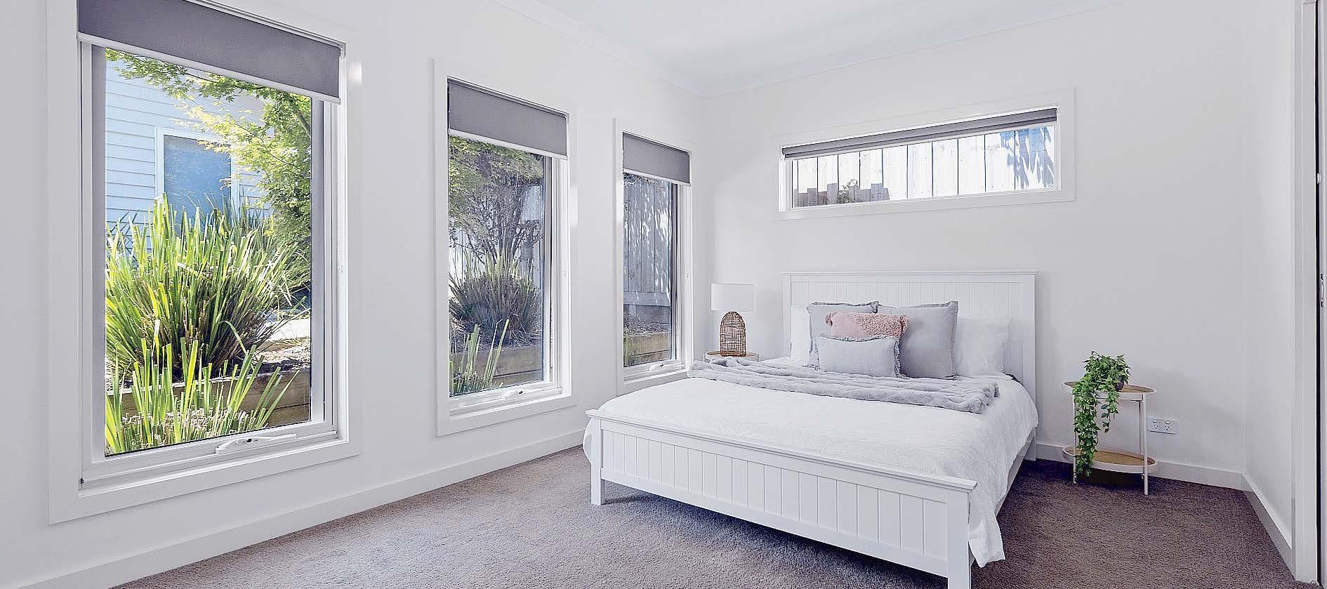 The master bedroom sits at the front of the home, filled with natural light through large windows and complemented by a walk-in robe and updated ensuite. A second bedroom with built-in robes — ideal for guests or shared living.