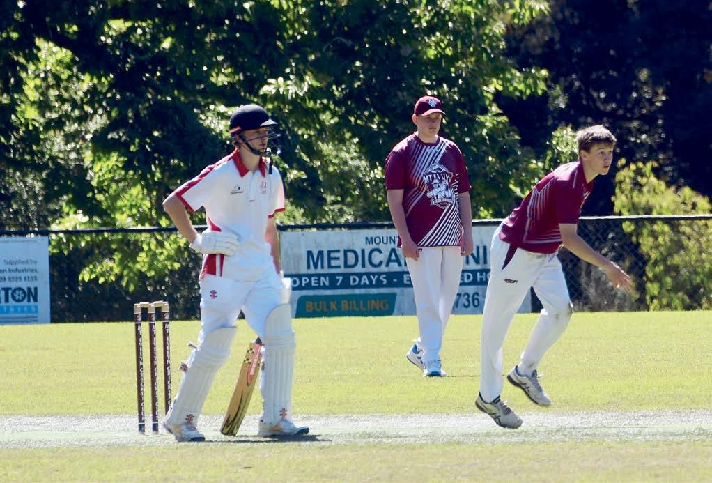 This week, they hosted Eastfield, who are battling with the Mounters for a place in the finals. The Mounters put their best foot forward with a comprehensive display on day one of their split-innings contest. Mt Evelyn bowled first, and after a quick brace of wickets from captain Billie Laird with the score on zero, the Eagles settled in for the fight courtesy of an excellent 59run third-wicket partnership to put the pressure back on the Mounters. As it looked as if Eastfield would take the game away from the Mounters, first-year players Jacob Glover (2/5) and Ben Dunstone (1/13) would turn the contest quickly, and when Laird (3/6) and Chase Missen (1/6) returned to the attack, the host turned the screws on a faltering middle order. When the split was closed, the Eagles found themselves in a spot of bother at 8/96.