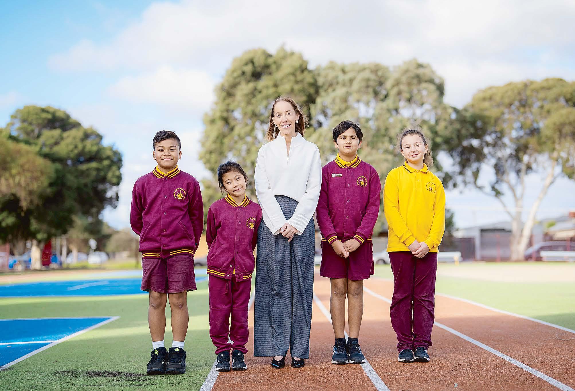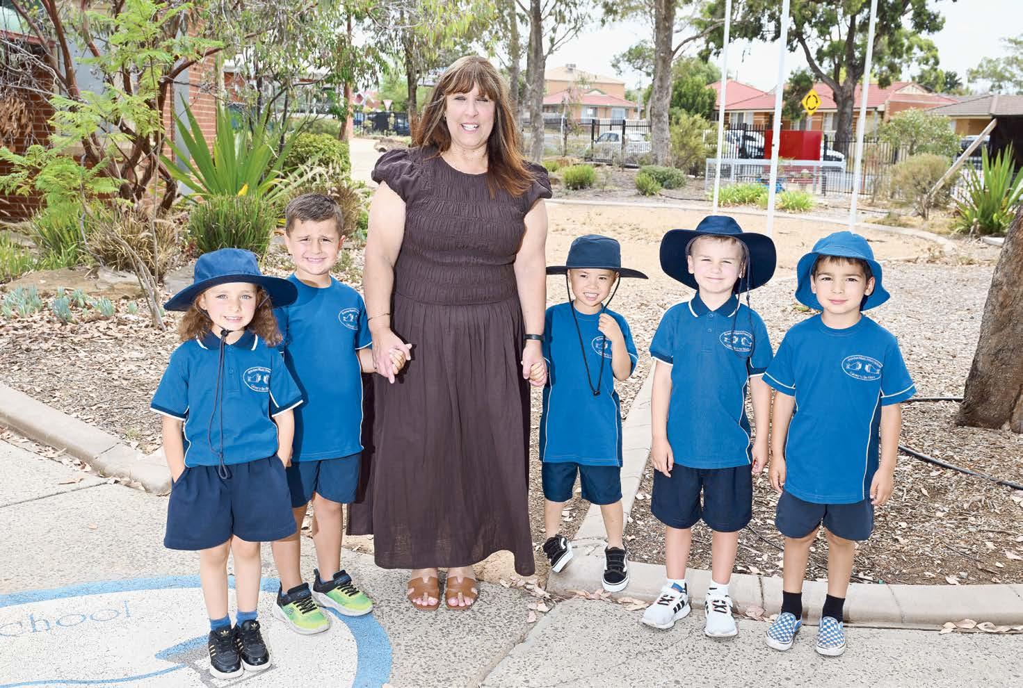 Sydenham Primary School principal Effie Sultana with preps Julia, Dario, Archer, Rafael, and Spencer. (Damjan Janevski). 530071_02