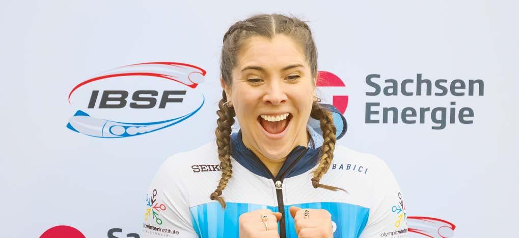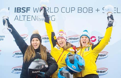Second-placed Bree Walker of Australia celebrates on the podium of the Bobsleigh World Cup, in Altenberg, Germany, on Saturday 17 January 2026. (Robert Michael/dpa via AP)