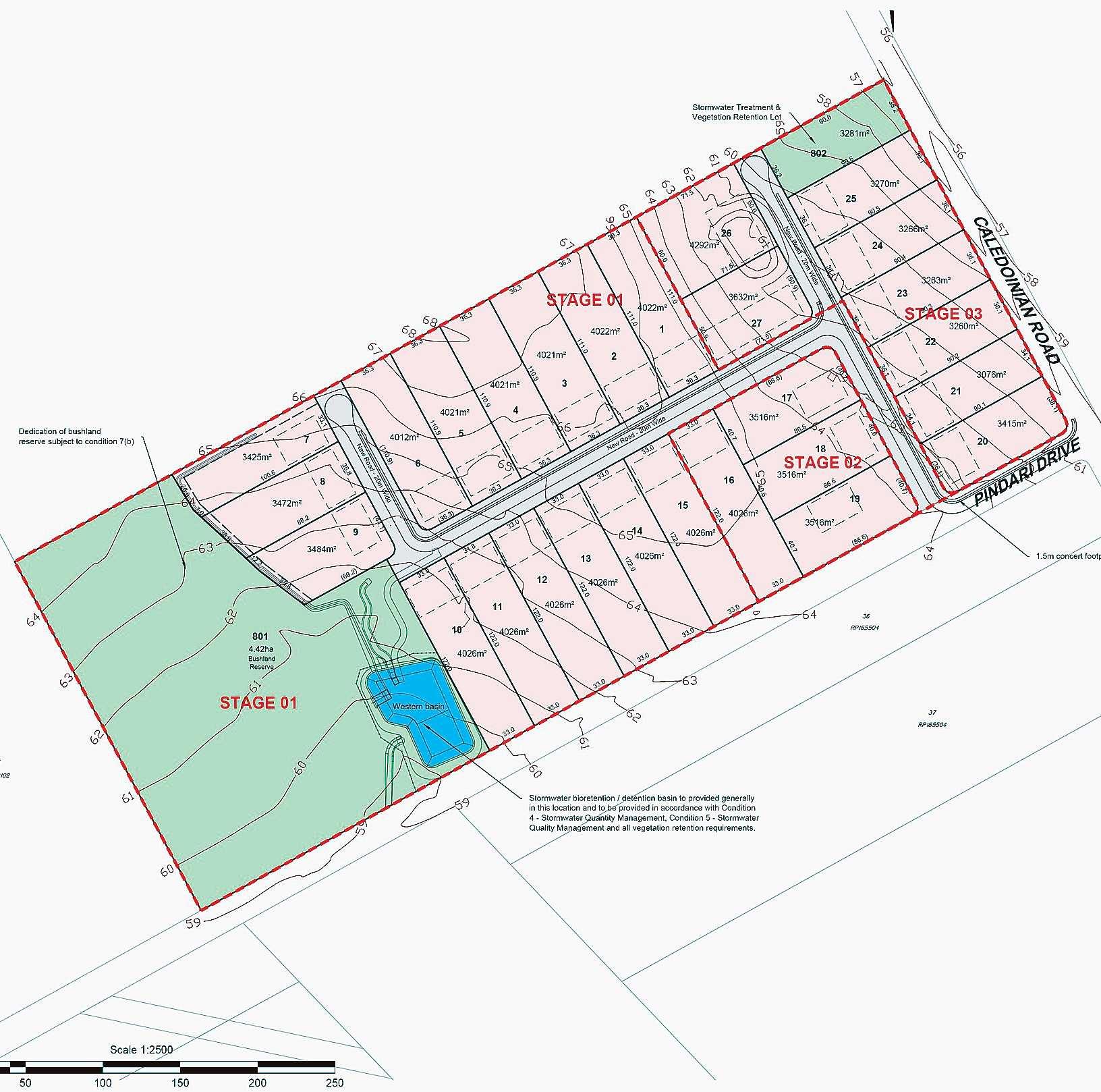 A diagram showing the lot layout on the approved subdivision at 226 Pindarri Drive, Mt Marrow across the three stages of development. The green coloured area at left shows the 4.42ha bushland reserve with the stormwater detention area coloured in blue. Each of the allotments has a rectangular box of dashes which indicates the building envelope within which the construction of homes and outbuildings must be confined.