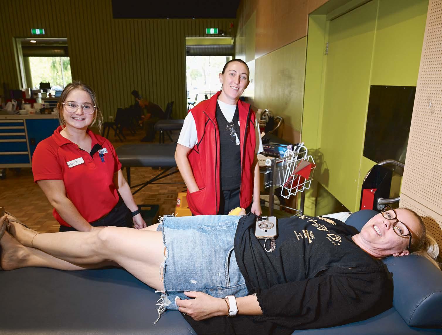 Lifeblood champion Renee Warner, with session leader Yvette Youl, and registered nurse Cassandra Neal. (Damjan Janevski) 532439_01