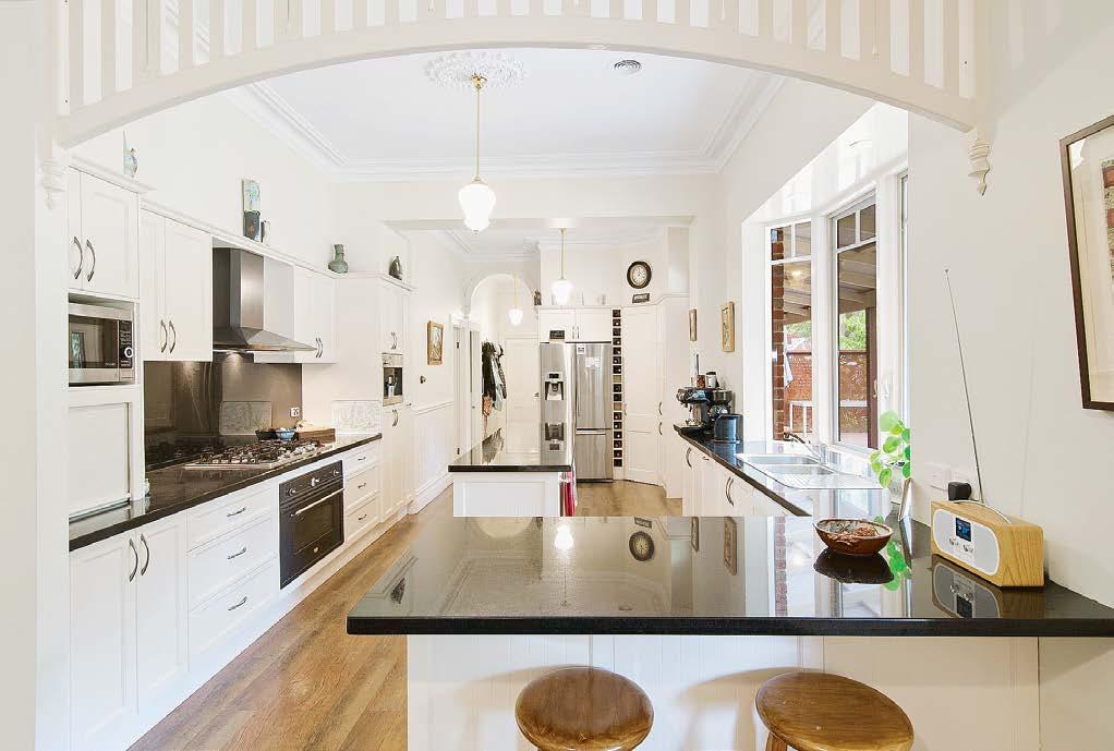 The fireside formal lounge is a standout of the living rooms that have 12’ ceilings above and wide hand-cut skirting boards below. The adjacent formal dining is set just off the showpiece granite kitchen with popular central