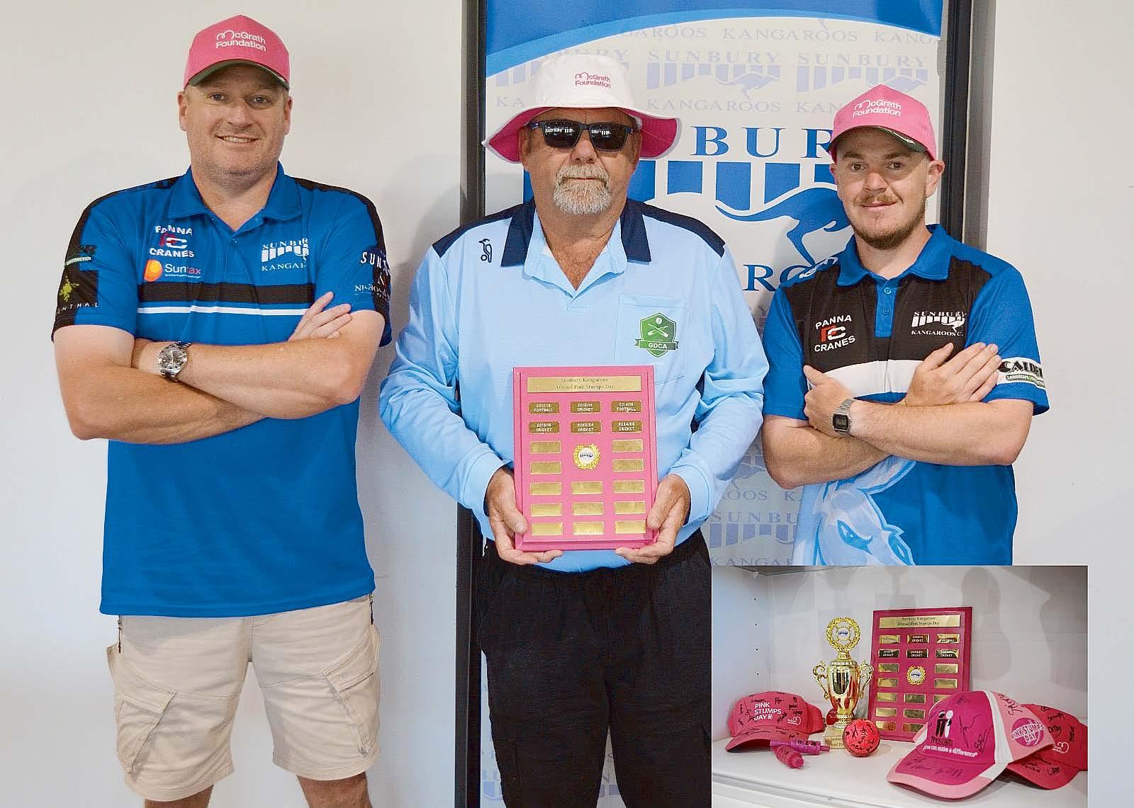 Football president Marc Bullows, umpire Steve Taylor and cricket president Hayden Humphrey. Inset: The shield the clubs are playing for. (Supplied)