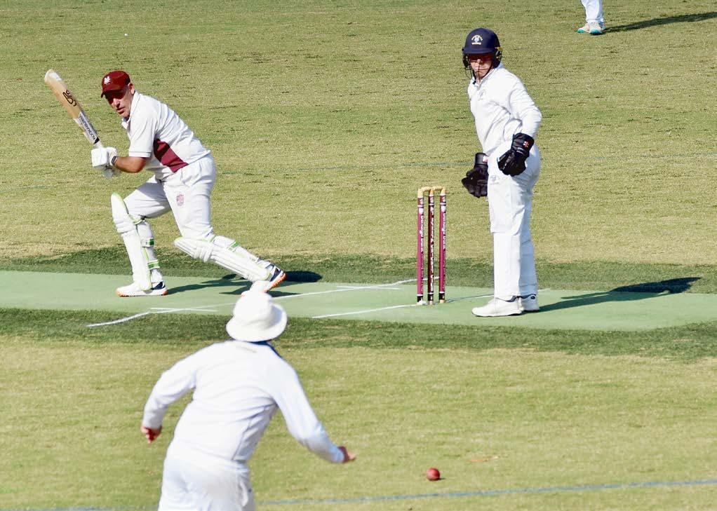 Mark Unternahrer at the crease. Unternahrer had been in stellar form peeling off three consecutive centuries in his previous three innings. In short, he continued his form with aplomb and shared a fifth wicket partnership of 156 with Andrew Woolhouse, who was dismissed in the 64th over for 56 off 131 balls (4 fours). At that stage, Unternahrer was on 77* with Kilsyth 5/206. The runs continued to flow with “Unters” adding a further 66 for the sixth wicket with Shaun Goodwin, who was caught and bowled by Leigh Walles for 18 off 47 balls (2 fours) in the last over of the day. Thus, Kilsyth finished on a respectable 6/274cc off the 80 allotted overs with Mark Unternahrer batting superbly to finish on 123* (16 fours). The multiple wicket taker for Ainslie Prak was Jack Simpson, 2/35 off 12 overs (2 maidens), with single wickets to Darren Walles, 1/22 off 11 overs (2 maidens), Leigh Walles 1/31 off 6 overs (1 maiden), Archie Tymensen 1/44 off 11 overs (2 maidens), and Archie Croot 1/53 off 14 overs (2 maidens).