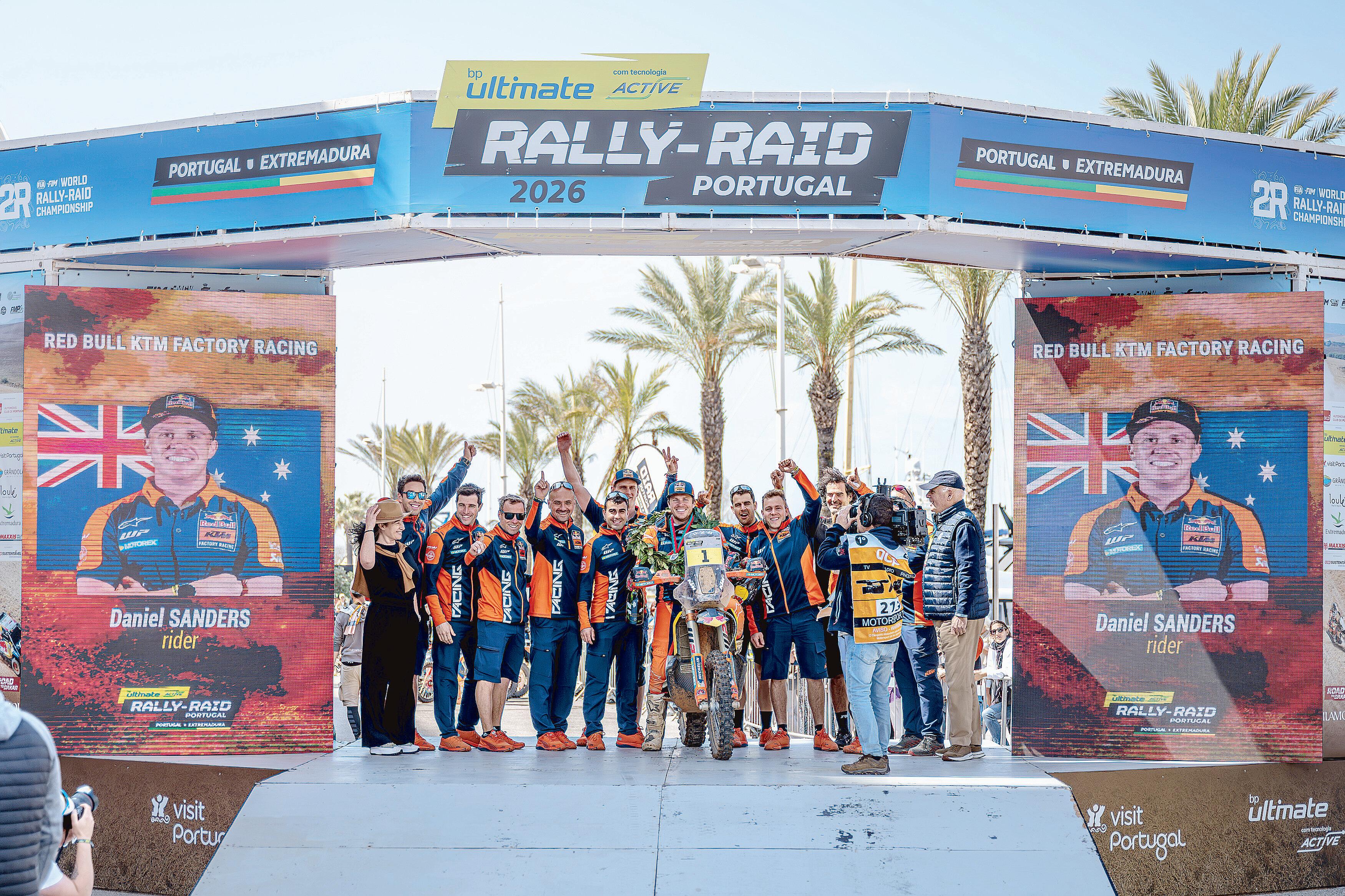 Daniel Sanders of the Red Bull KTM Factory Racing is seen at the finish line of BP Ultimate Rally Raid Portugal 2026 in Algarve, Portugal. (Kin Marcin / Red Bull Content Pool)