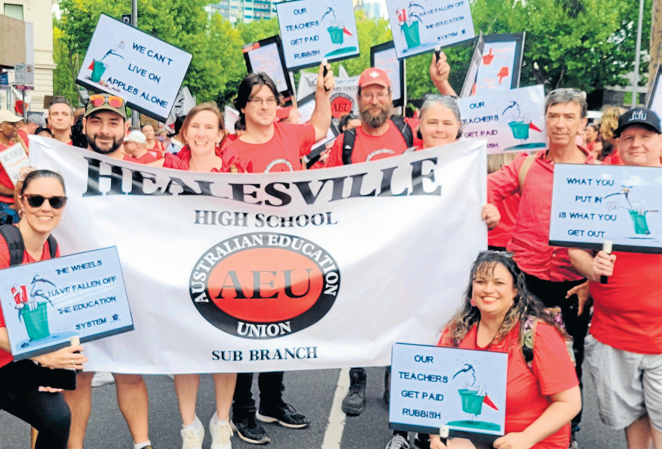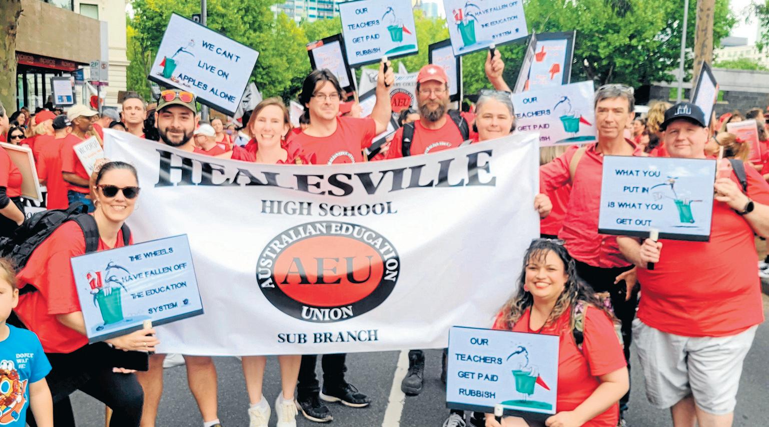 Staff from Healesville High School and Upper Yarra Secondary College joined a statewide teacher march for better working conditions and pay on Tuesday, 24 March.