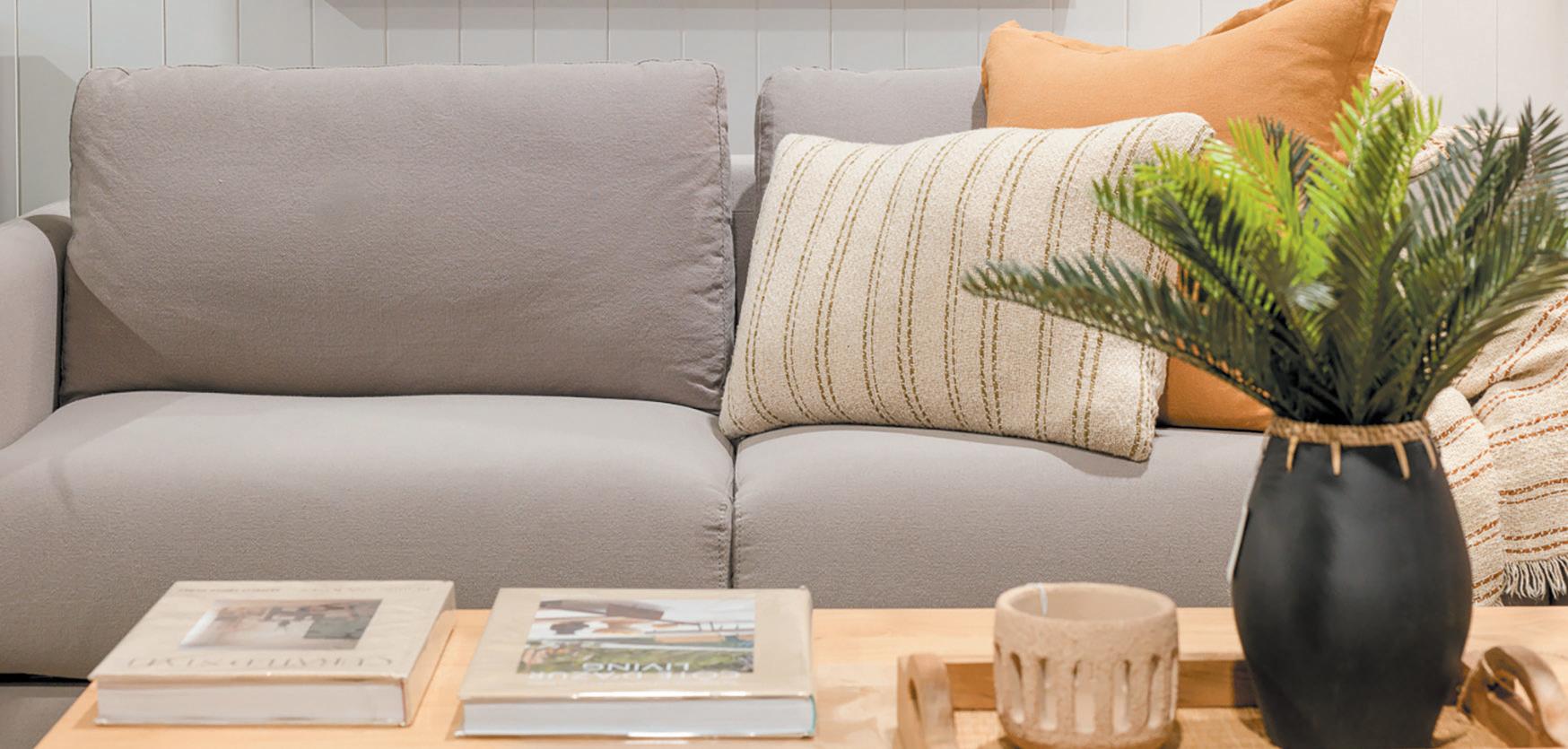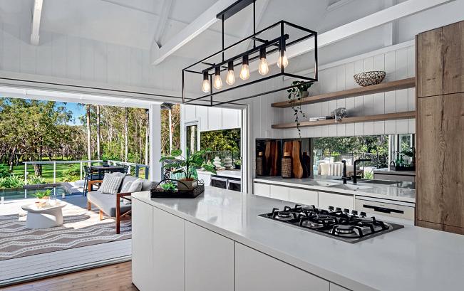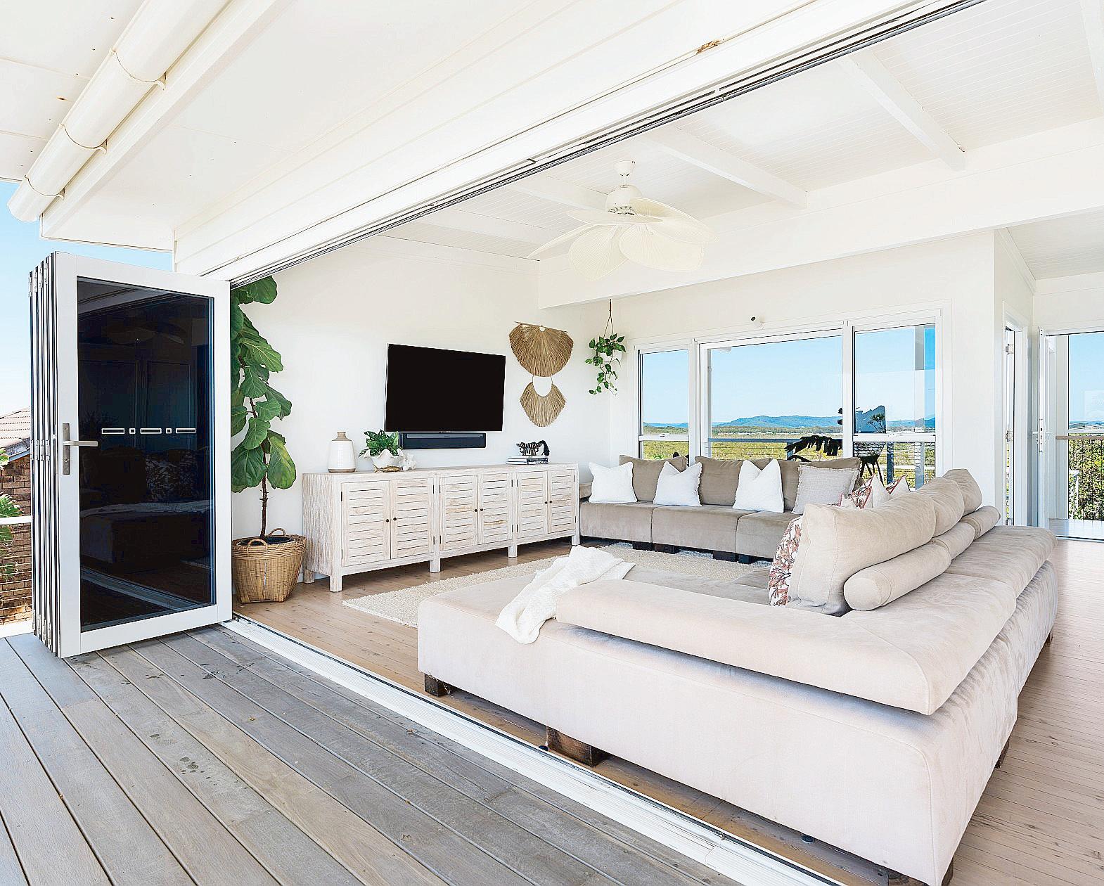 the relaxed coastal aesthetic. Soaring raked ceilings create an impressive sense of volume and light, while the loft-style bedrooms upstairs offer a peaceful, retreat-like feel.