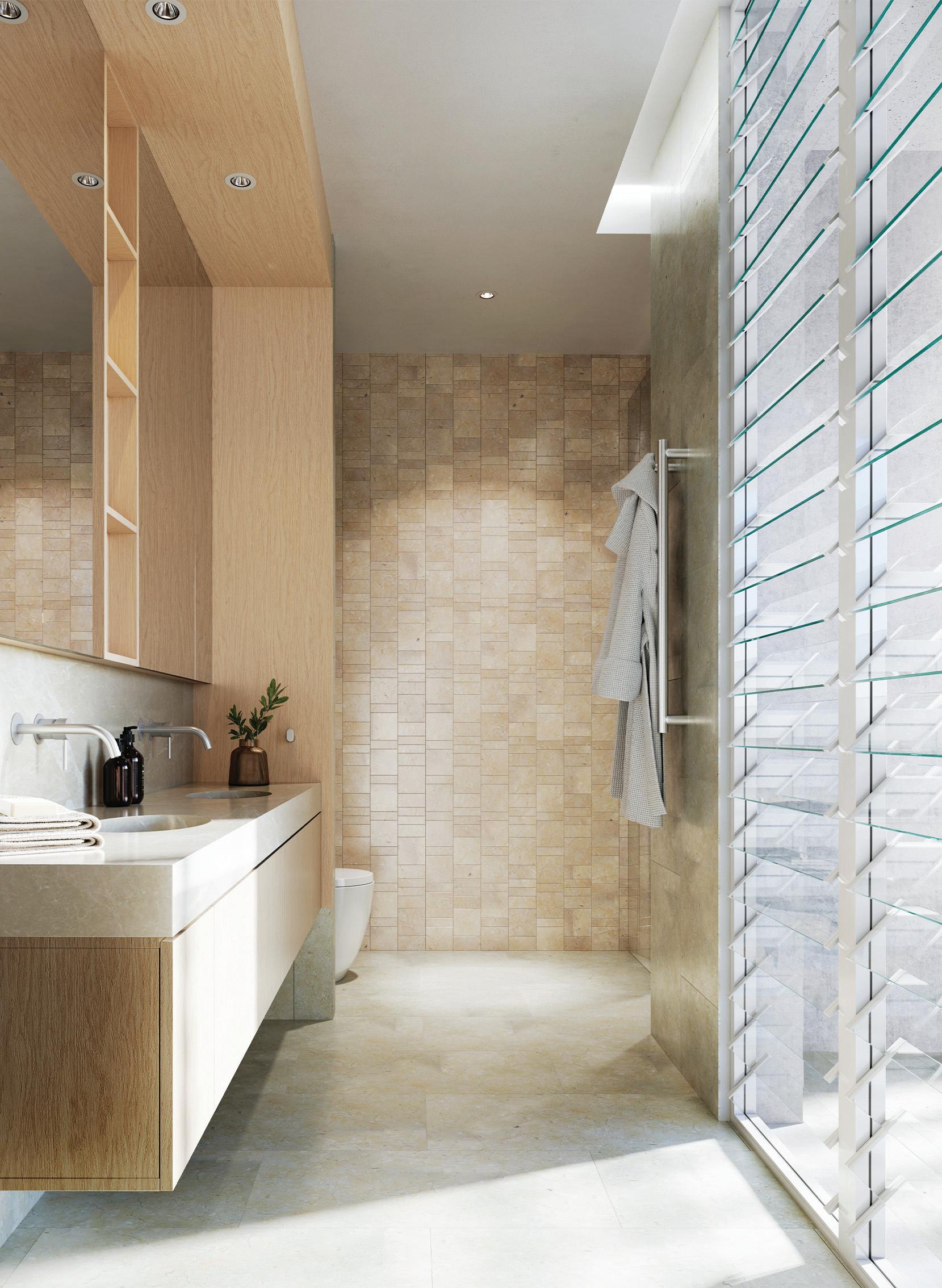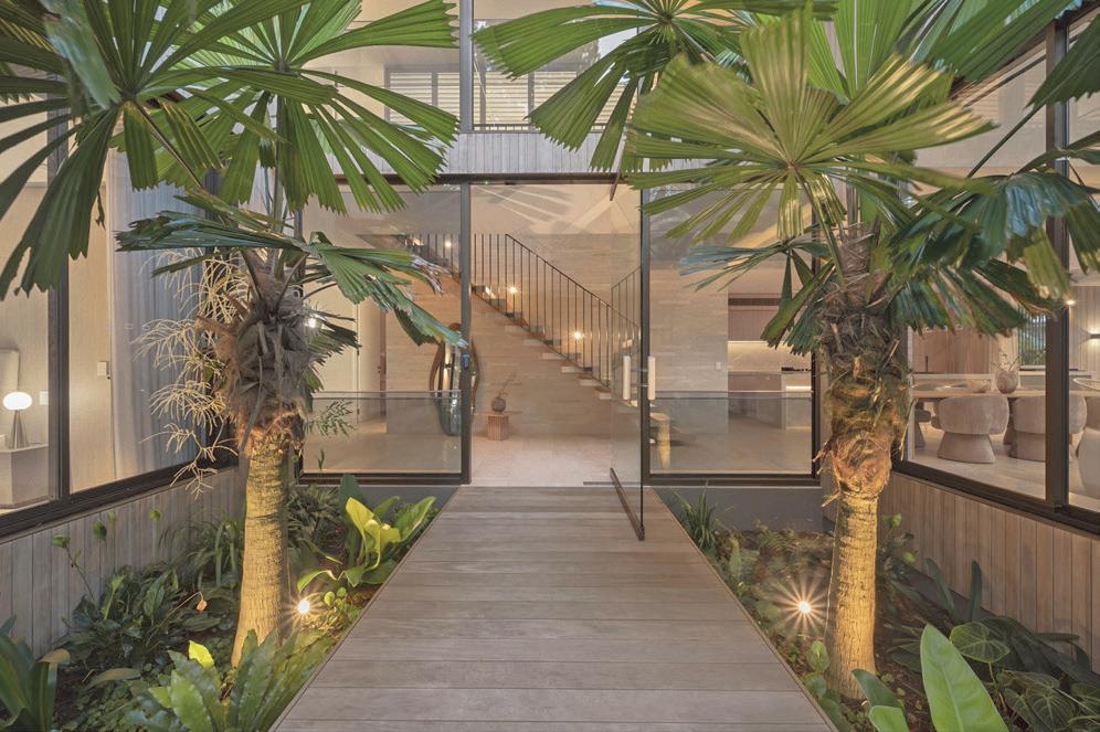 Statement double timber-framed lami-glass doors open to the foyer of the home, then to the tall doors and walls of glass, high ceilings and skylights that allow sunlight to splash over the Italian pastel grey stone flooring.