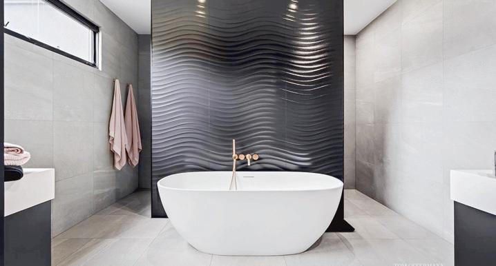 The laundry has lustre wave tiles, a stonetopped bench, a wall of black glass sliding doors plus access to the drying area. Stonetopped cabinetry and latest tech is in the office
