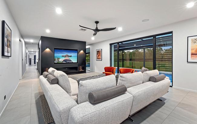 Sprawling living areas connect to outdoors, including a dedicated lounge room with feature lighting and surround sound.