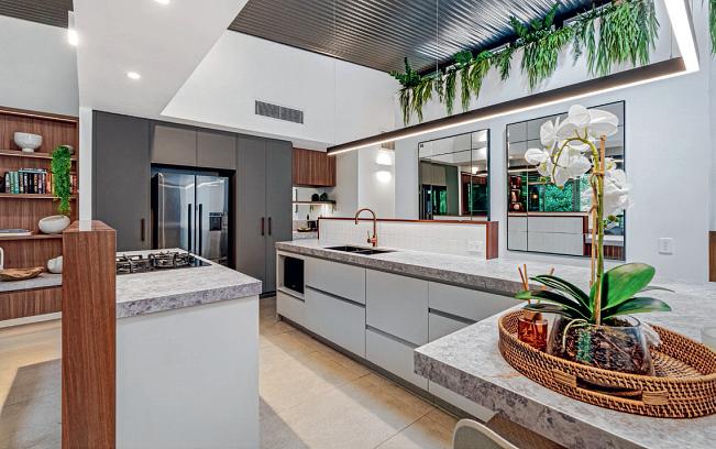 • Designer Kitchen – Integrated appliances, double ovens, Brazilian natural stone benchtops