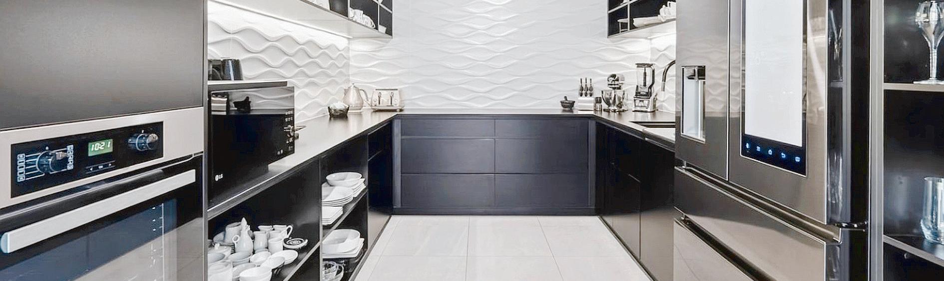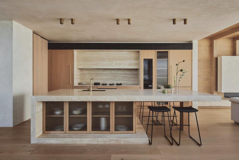lustre wave tiles and the latest appliances from Miele induction cooktop and oven, to integrated AEG dishwasher and a Samsung four-door fridge with television.