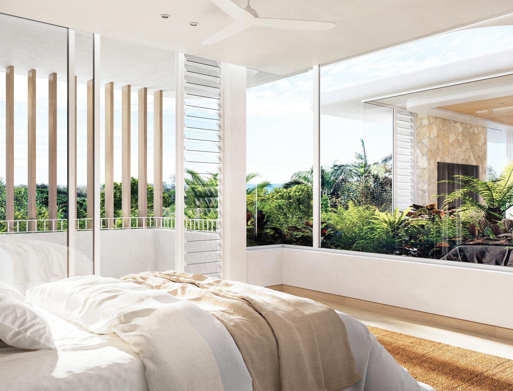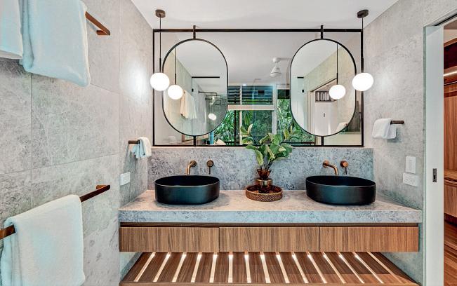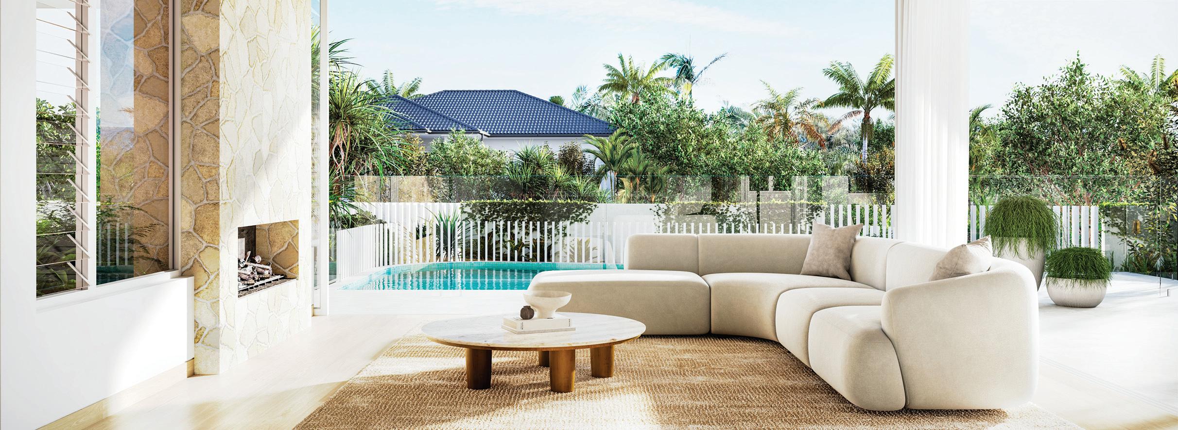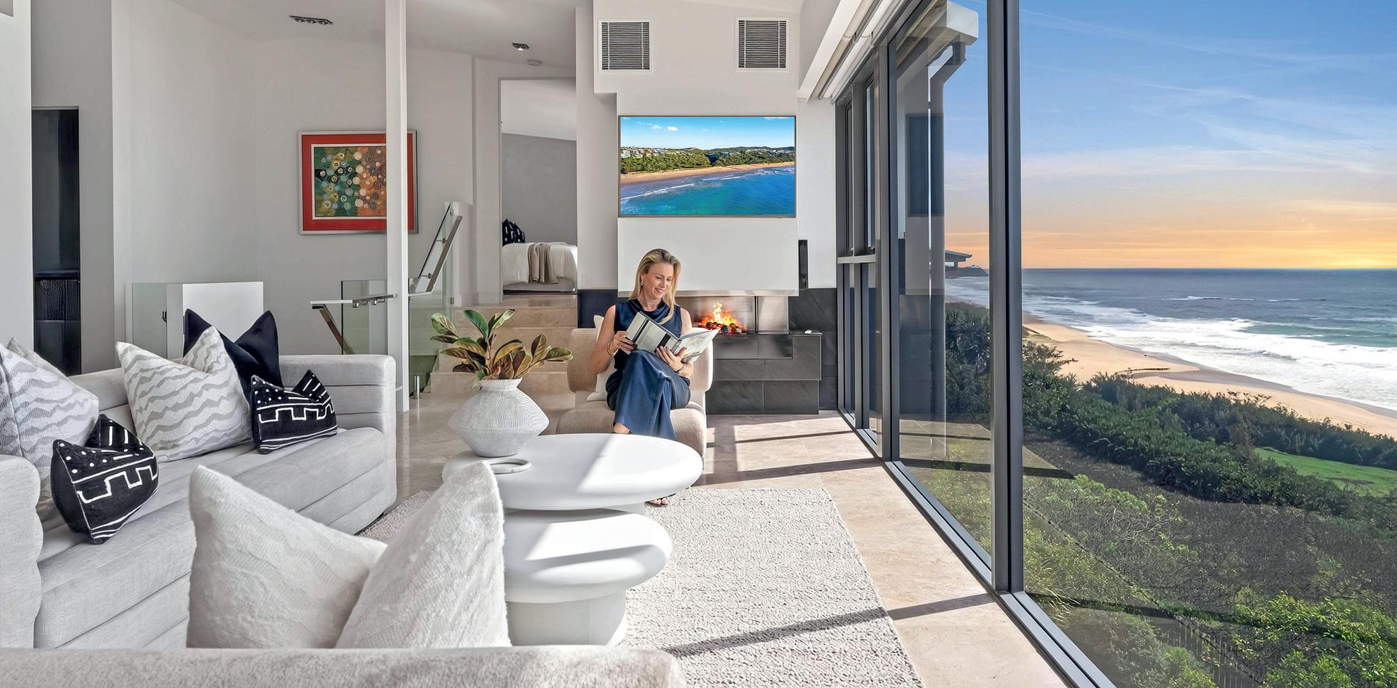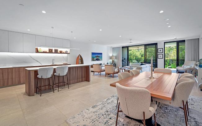 Inside, the home immediately impresses with burnished concrete flooring, soaring ceilings and an abundance of natural light. Warm Blackbutt timber floors and striking Brazilian natural stone surfaces create a sophisticated coastal aesthetic.