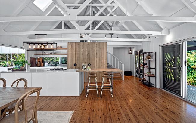 Inside, there is a timber kitchen featuring original bamboo benchtops that complement