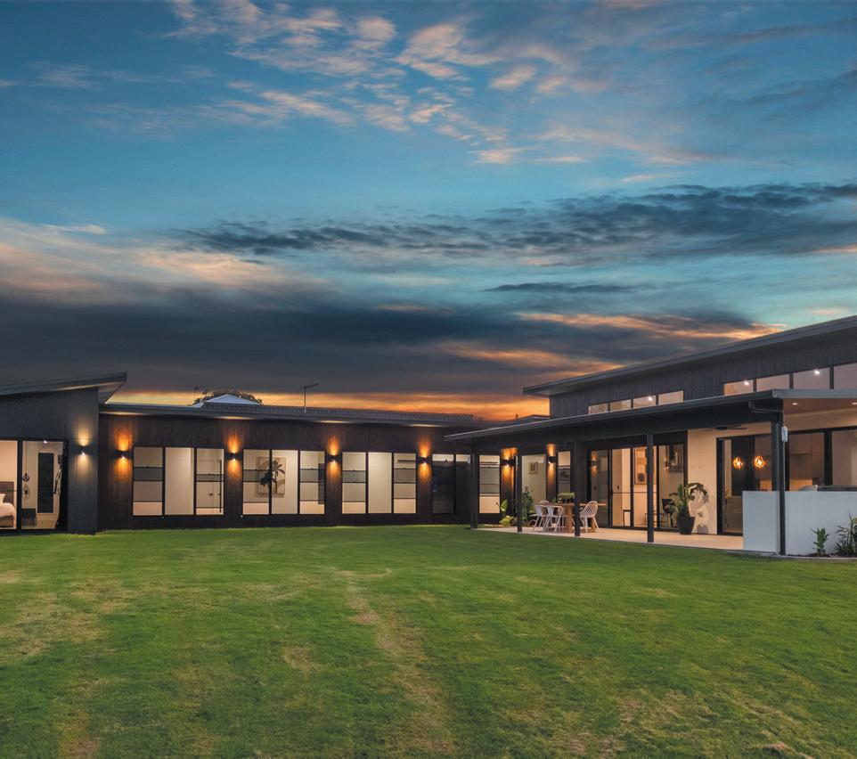 A deck stretches the full width of the home, capturing a north-easterly outlook.