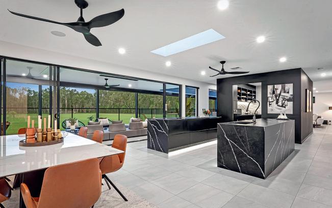 The open plan dining space includes the massive kitchen with two parallel island breakfast bars, black and white-streaked stonetopped cabinetry, soft-close deep drawers, sizeable butler’s pantry with three-dimensional