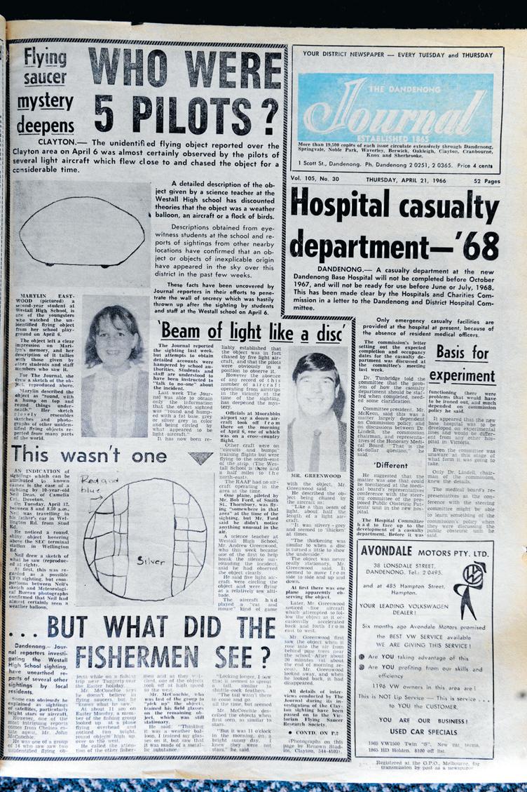 On 6 April 1966, she was in science class about 10.30am when a girl raced in from the corridor to say there were flying saucers in the sky. Her teacher Andrew Greenwood, who was later interviewed by Dandenong Journal, wouldn’t let the students out until the recess break.