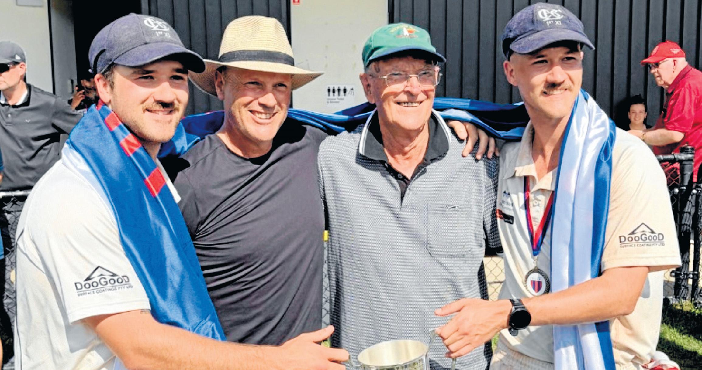 Jarryd Wills (far left) and Toby Wills (far right) celebrate Berwick’s premiership with club champions, father Gavan Wills and grandfather Brian Wills. (Supplied)