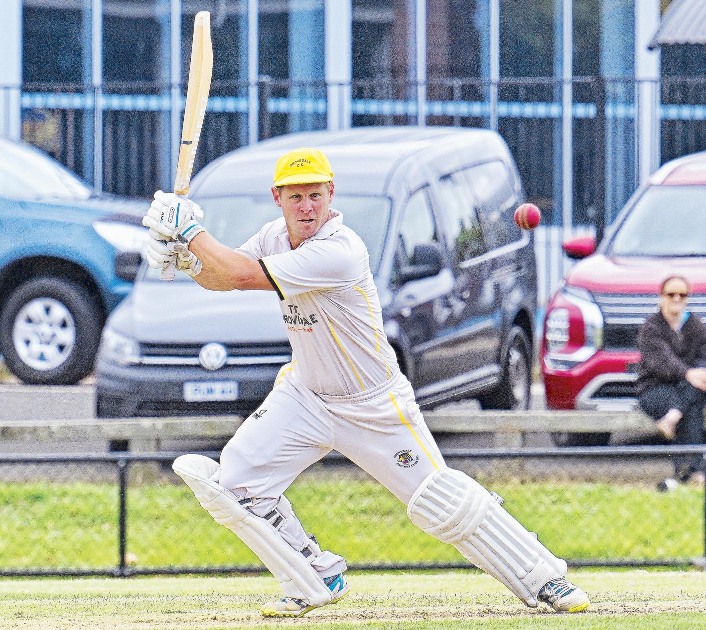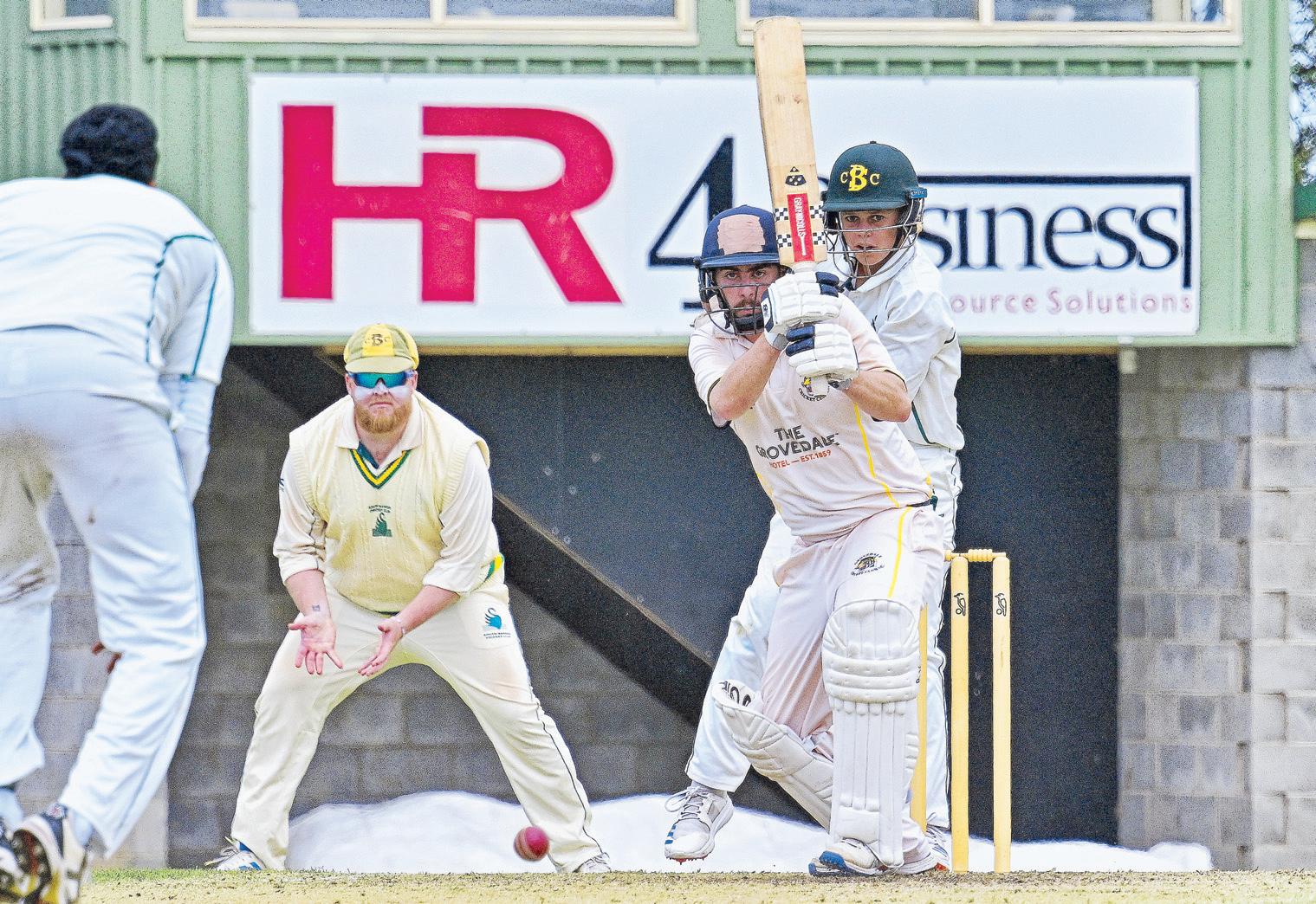 Left: Jordan Moran square drives for four during his magnificent 131 for Grovedale. (Pictures: Ivan Kemp) 537708_11 Right: Grovedale’s Daniel Brew hits high to mid-wicket and is caught for 38. 537708_17