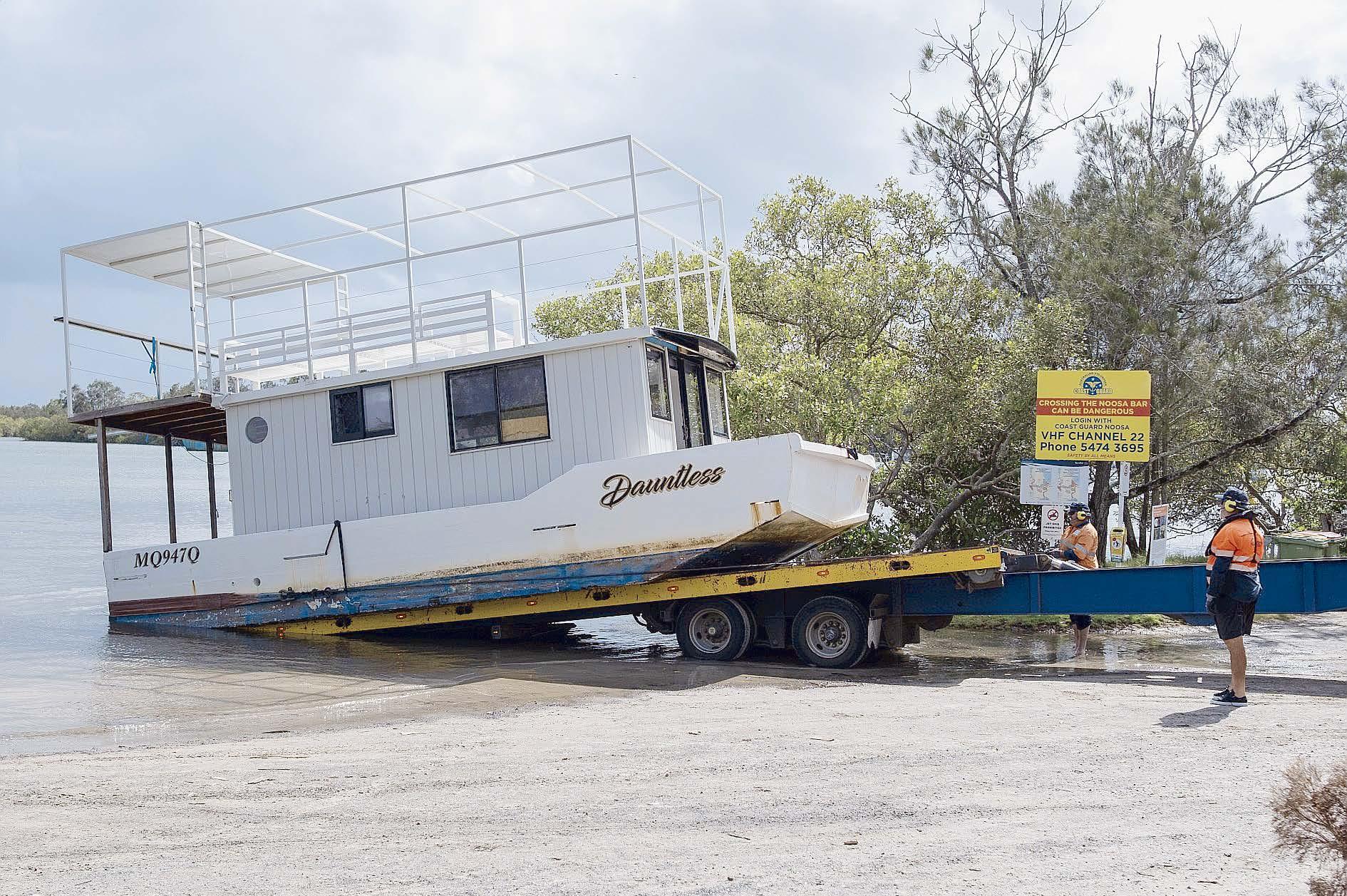 Claytons Towing remove a houseboat from Noosa River on Monday, bound for Noosa Tip. (Rob Maccoll)