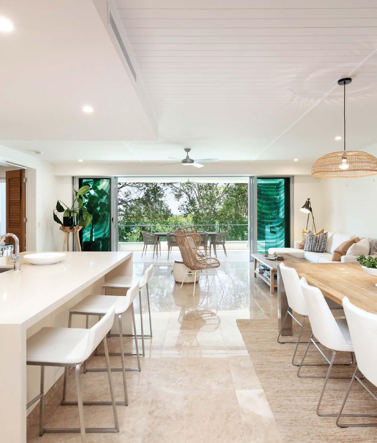 Substantial open-plan dining and living spaces flow out to a north-easterly covered balcony. The contemporary kitchen with stonetopped island and breakfast bar, 2-pac cabinetry plus high-end appliances has everything needed for entertaining. Banks of bright white plantation shutters are throughout, including in the spacious main bedroom suite. It has a lounge, walk-in-robe, a desk and bright and light ensuite - and the outlook from the balcony includes great water views over the top of Quamby Place, across to the Noosa River and Noosa North Shore.