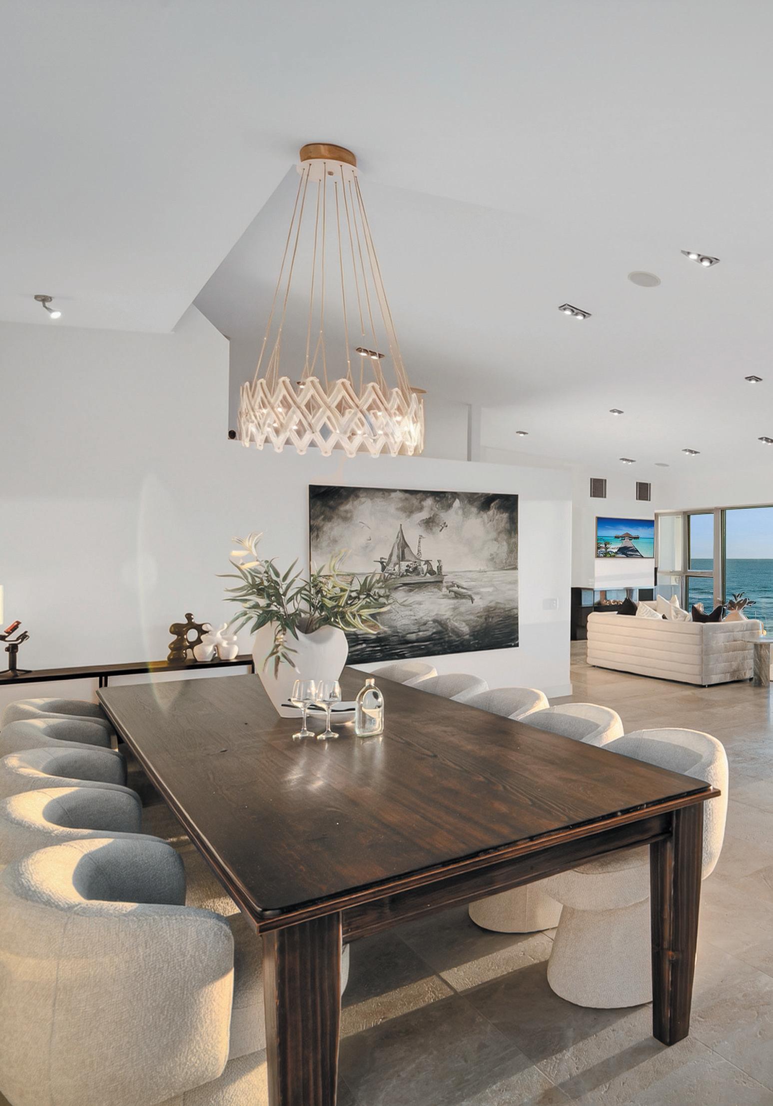 Beinstantlybesottedbythegallery-likehallway,tallwall ofpanesinterconnectingthespectacularpoolpavilion andsunterrace,reminiscentofaboutiquehotel,also multiplevoluminousliving,diningandleisurespaces, indoorsandout.Andthankstoloftyclerestoryceilings andlengthynorth-facingdisappearingdoors,dappled naturallightshadowdancesoverendlesstravertine.