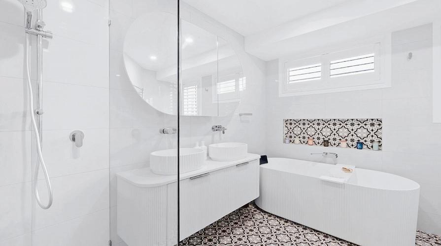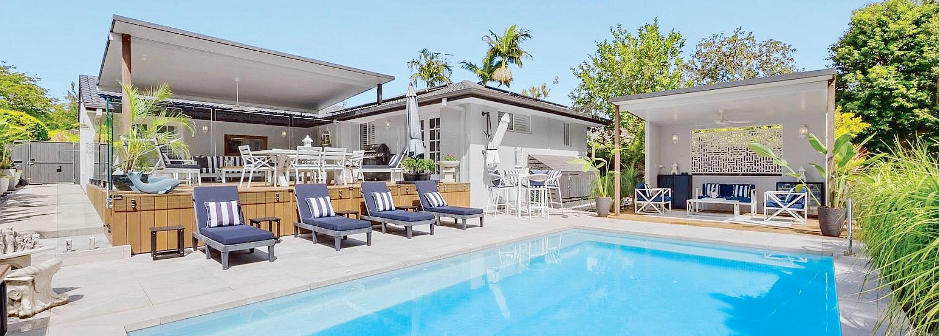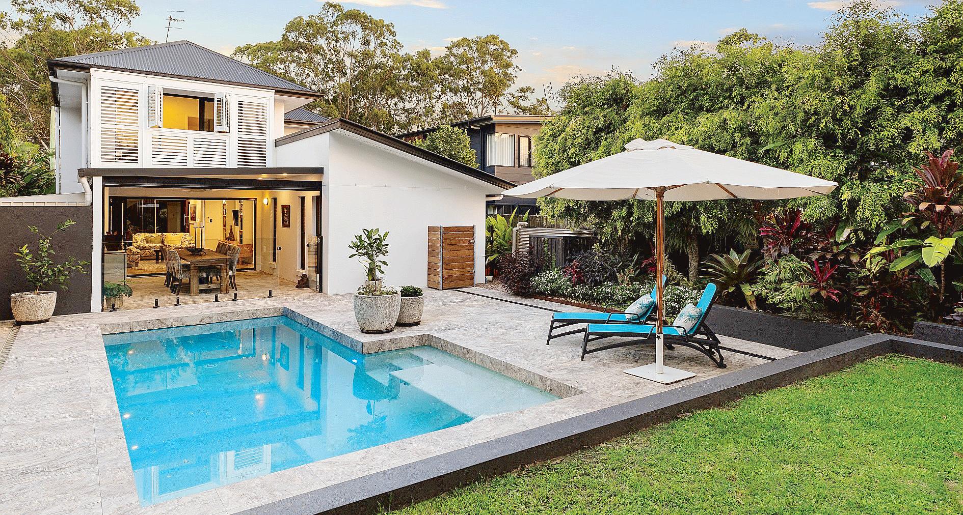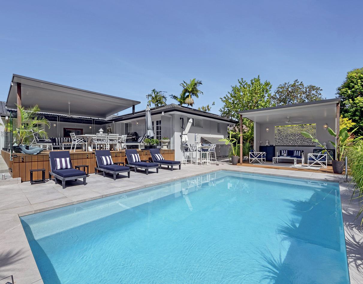 The California-style bungalow has been designed for effortless indoor–outdoor living, with a resort-style entertaining zone featuring terraced decking and a spacious paved pool area.