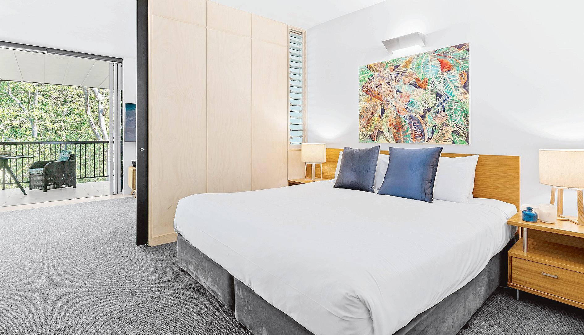 The bedroom opens to a secluded balcony that overlooks Noosa National Park, with quiet glimpses of the ocean horizon through the trees.