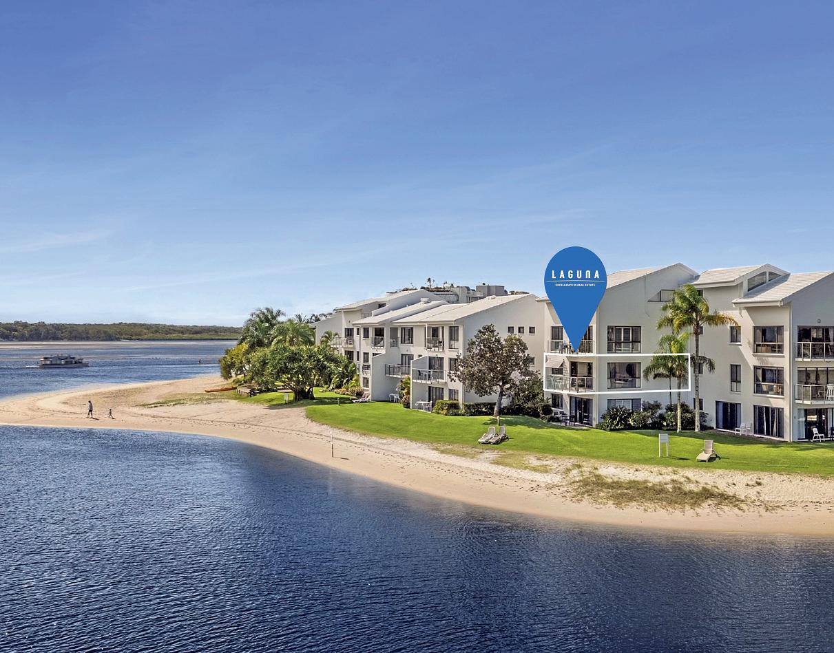 A two-bedroom, two-bathroom, one-car apartment at Noosa Heads provides an affordable entree to waterfront property.