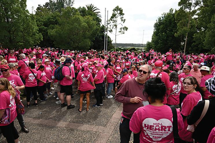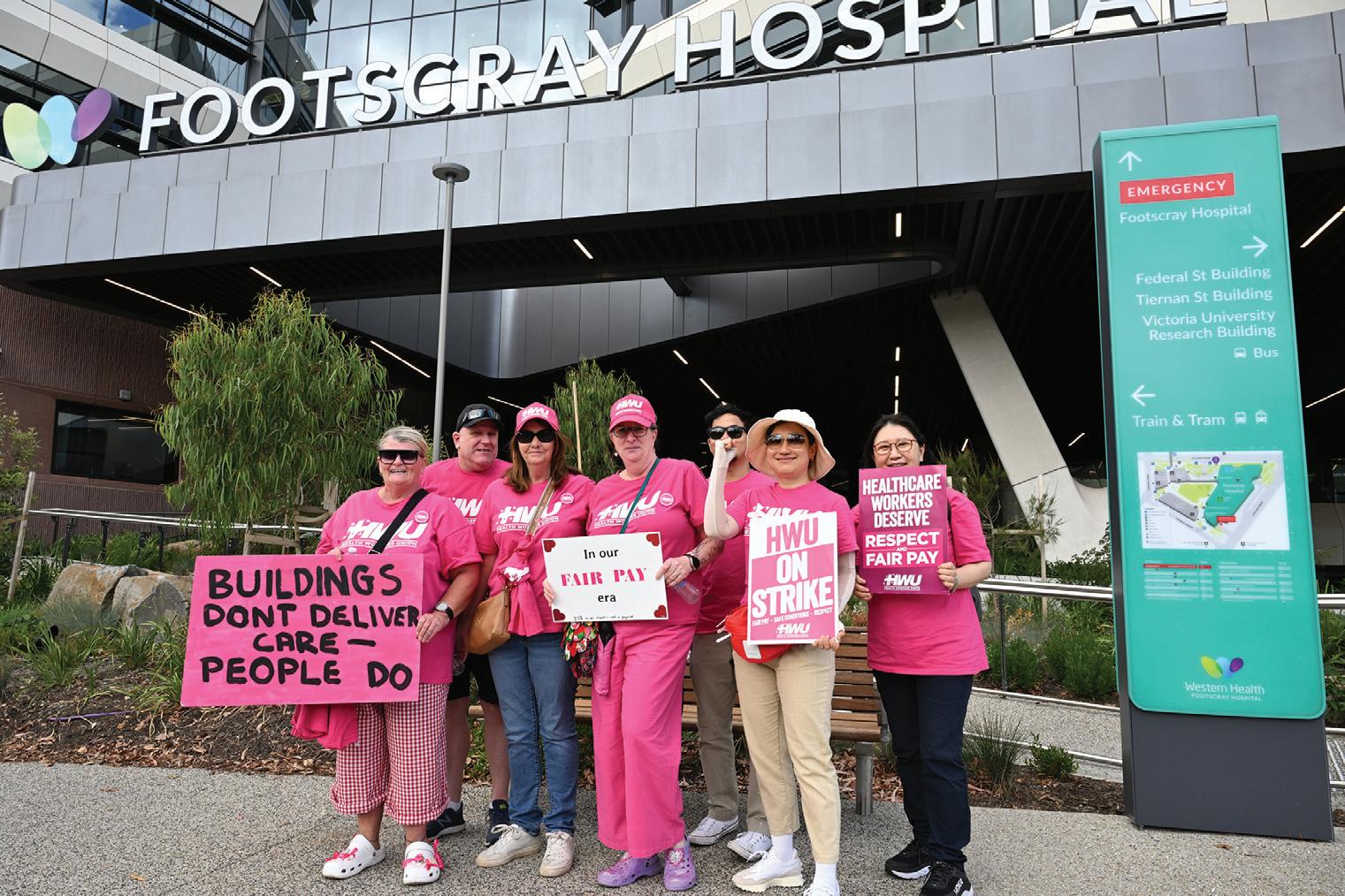 workers from across the state clad in pink HWU shirts gathered in Footscray Park across the road from the new hospital, before marching up Ballarat Road to the entrance and then into its village green areaforcelebratorylunchtimerally.