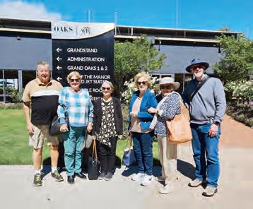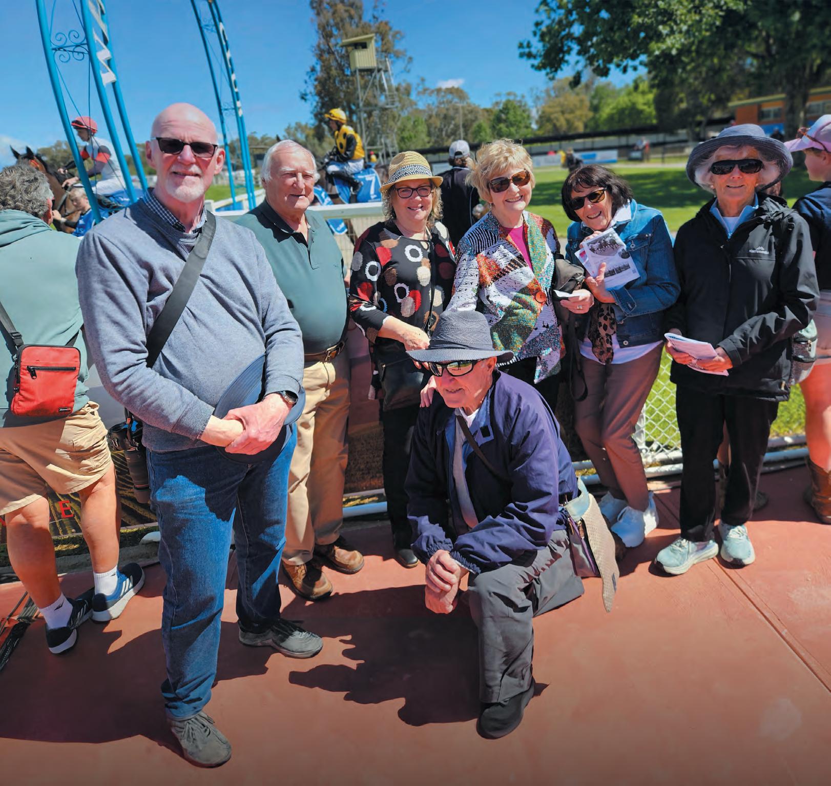a photo opportunity at the Wangaratta Races; pictured (standing) Kevin Robley, Theo Grummisch, Lynne Pearce, Wendy Gersh, Sue Grummisch, Anne Magee and (kneeling) Alex Magee. See page 3