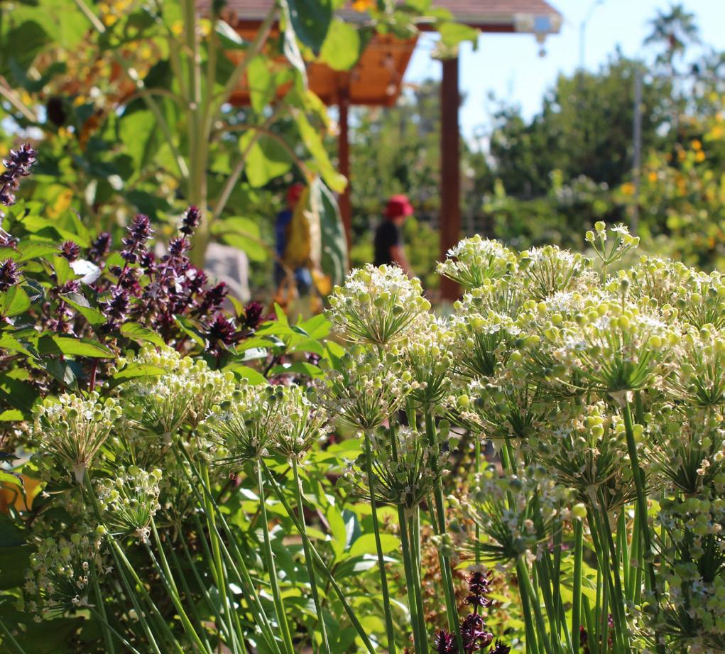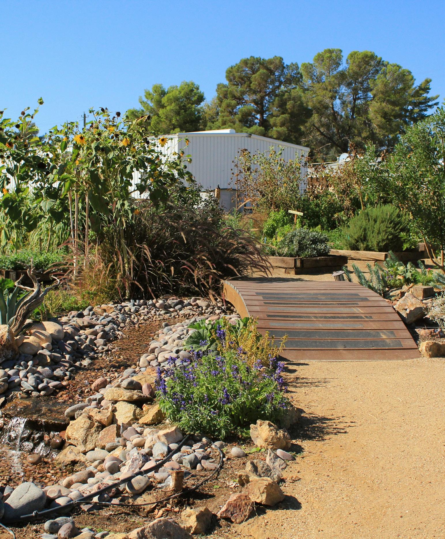 Each year, the garden incorporates new plants that are requested by community members. This year’s newest crop additions include tomatoes, blackberries, okra, basil, rosemary, mint, thyme, sage, garlic, cilan tro, parsley, tomatillo, and many more. Experimental crops, such as kiwi and passion fruit, are also grown in the garden to provide a fun learning experience. Adjacent to the garden beds, there stands over eighty plentiful fruit trees offering produce year-round. In addition to edible plants, the garden also incorporates many desert-native and desert-adaptive plants includ ing lantana, Red Fountain Grass, Mexican Petunia, Gopher Plant, and Sparklette Bells. When guests visit the garden, they can meander down pathways, listen to the soothing sound of the garden’s waterfall feature, relax on garden benches, enjoy local art, visit the chicken coop, or pick up a book from the Free Little Library.