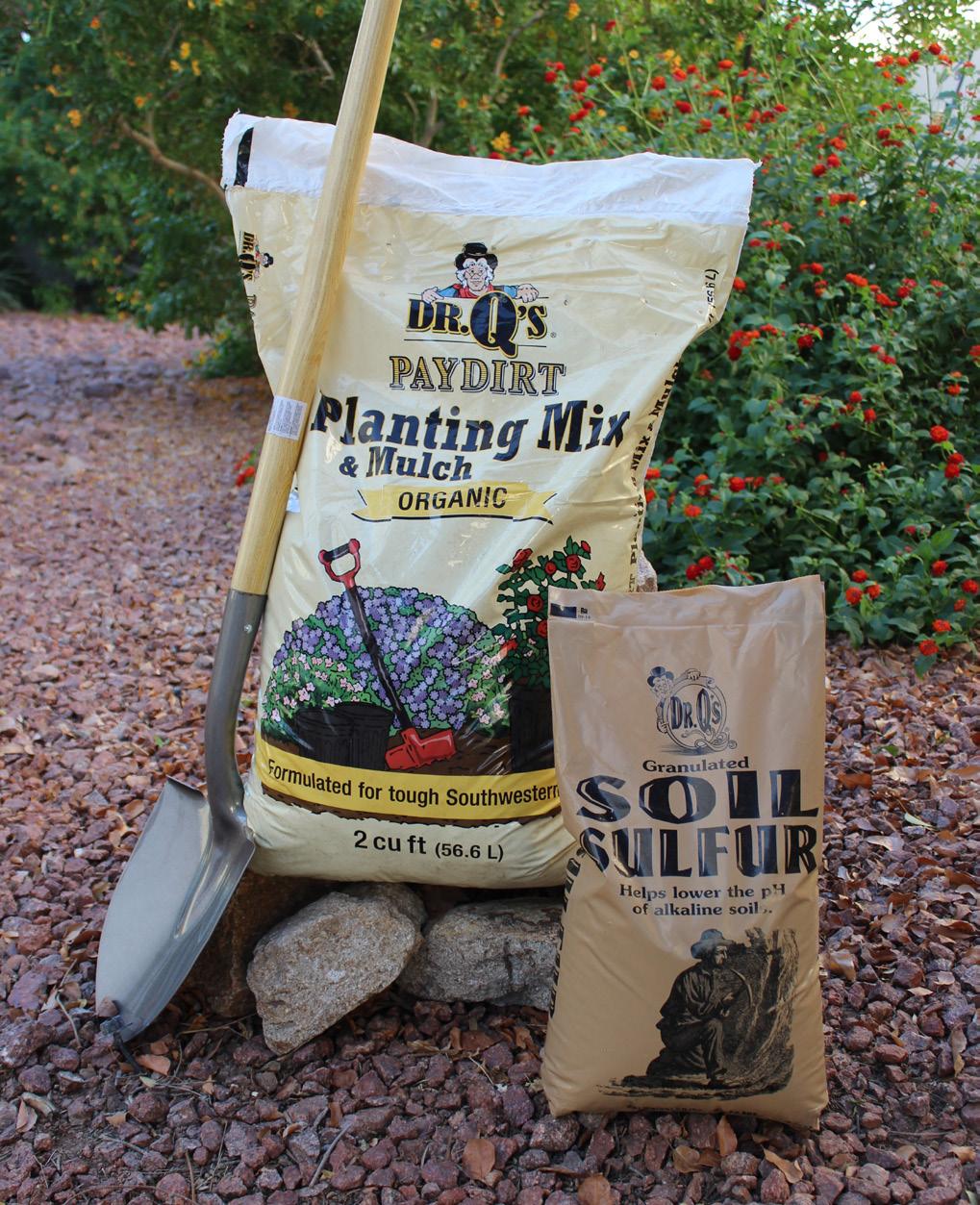 Although desert soil has a naturally high pH level, gardeners can lower the pH by adding elemental sulfur. When oxidized, elemental sulfur will convert to sulfuric acid, which will break down caliche and make the soil more acidic. When applying elemental sulfur, use 15-20 pounds of Dr. Q’s Soil Sulfur per 1,000 square feet, then till about 6-8 inches deep. Avoid applying sulfur in the hot, summer months and avoid using am monium sulfate, as it will not cause the correct chemical reaction.