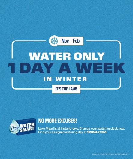 In addition to insulating plants and their root systems, gardeners should slow their watering schedule to one day per week from November to February. Not only are gardeners mandated by the Southern Nevada Water Authority to restrict watering, but over-watering