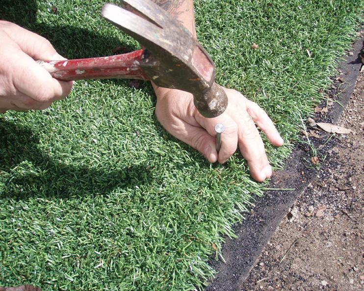 4. Fasten one end with 40D or 60D nails, spaced 3-4 inches apart. Stretch turf and fasten with nails as you move across to the opposite end. Place a nail every 12-24 inches throughout center and every 3-4 inches along perimeter.