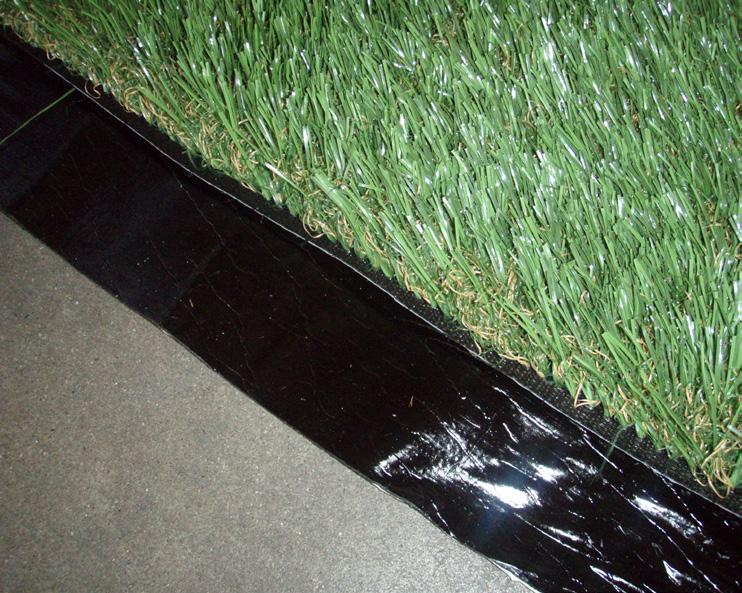 5. Fasten together any seams using 40D nails, spaced 1-2 inches apart. (Do not counter sink nails along seams) Use turf tape to secure seams. Apply tape lengthwise to bottom side of turf, leaving 3” stuck to turf and 3” hanging off. Lay turf back down (tape should be sticky side up - do not peel away liner) and secure opposite piece of turf to tape. Note: Be sure seams are tight and precise, and that the grain of your turf is all facing the same direction.