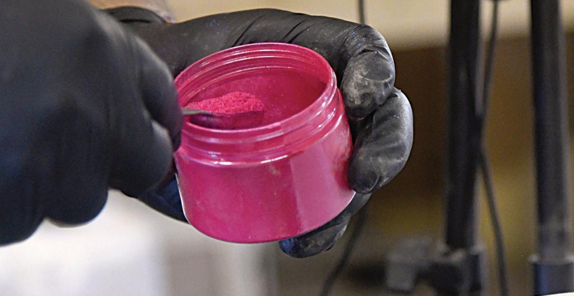 Stetson Mumma pours epoxy March 12 at his shop near Altura. The epoxy is expensive to work with, costing at minimum $80 a gallon.