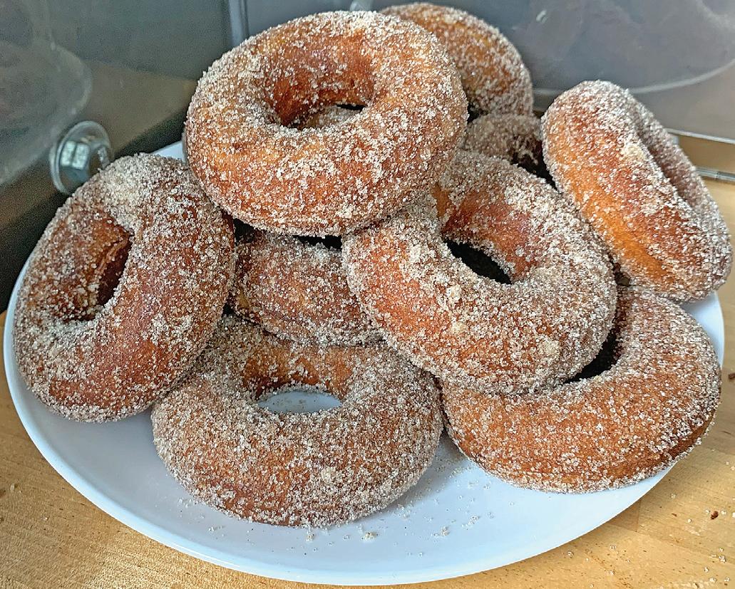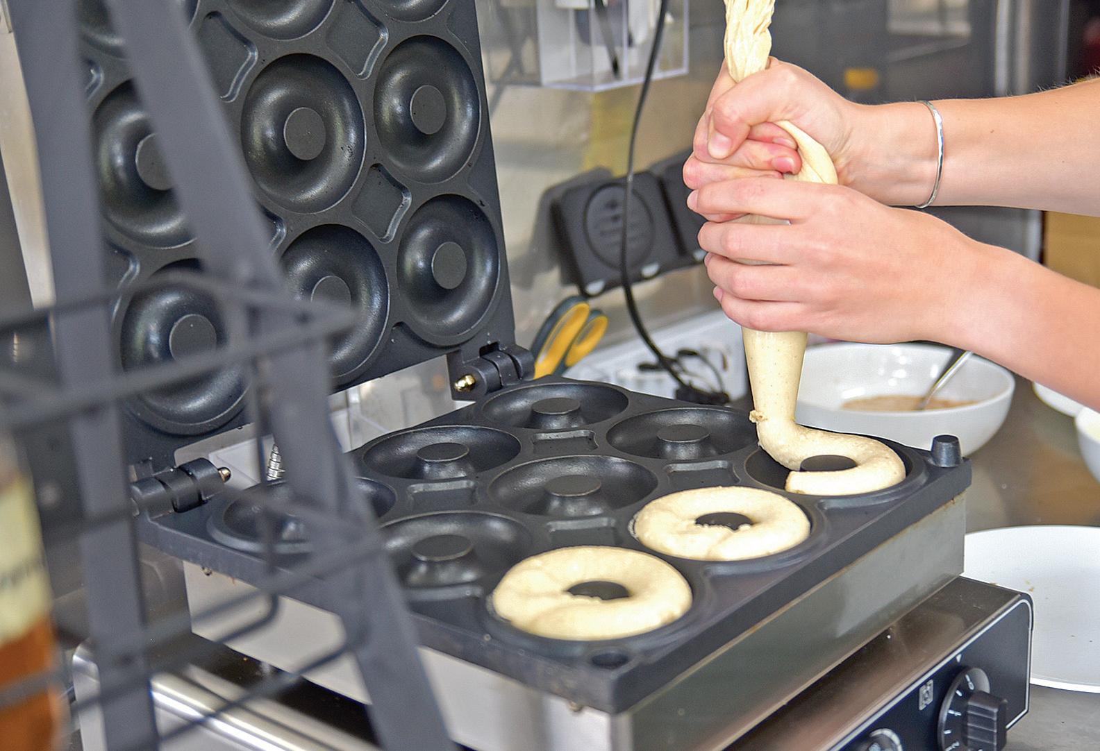 “I make the donuts throughout the day to keep them fresh when people buy them,” she said. “All I do is pour the batter into my donut machine and then dip them in butter and cinnamon sugar.”